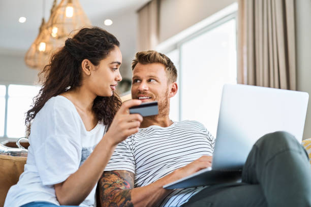 Young woman holding credit card by boyfriend paying through electronic banking. Smiling multi-ethnic couple is shopping through laptop while sitting on sofa. They are in living room at home.